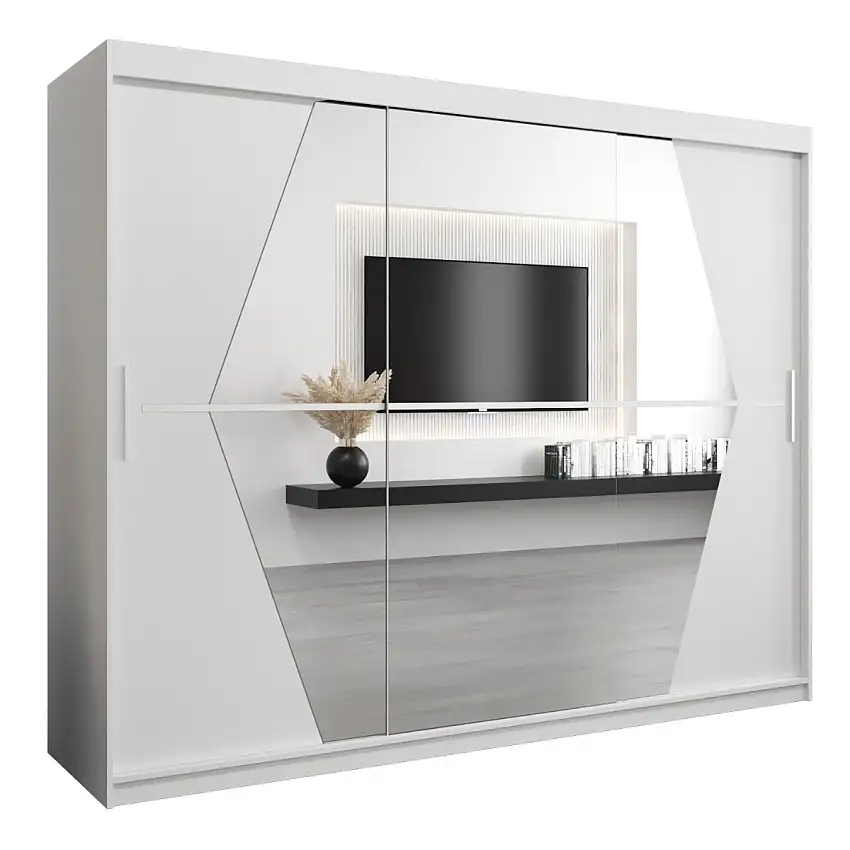 Wählen Sie unseren 250 cm breiten Schiebetürenschrank mit 10 Fächern und 3 Türenin weißer Laminatelementen, um Weitsicht in Ihrem Zuhause darzustellen und eine moderne Note zu verleihen.